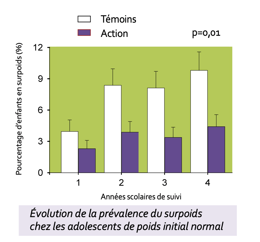 79% des enfants des collèges action contre 47% des collèges témoins avaient une activité physique de loisirs encadrée (figure de gauche). Cette augmentation de l’activité a eu un impact sur la composition corporelle des enfants, puisqu’il y avait 50% de surpoids en moins dans les collèges pilotes (figure de droite).