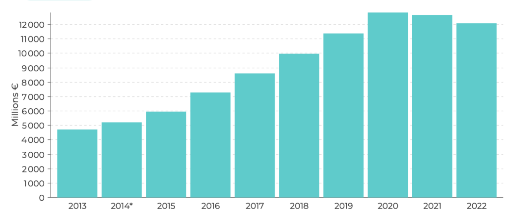 Comme le montre le schéma, après une forte progression entre 2015 et 2020, les ventes de produits biologiques se sont tassées en 2021 pour reculer en 2022. La part de marché est passée de 6,6% en 2021 à 6,1% en 2022. Bien sûr, il y a l’inflation qui a été très importante en 2022 et les Français ont moins consommés d’une manière générale. Cependant proportionnellement, les produits bio ont moins augmenté que les produits conventionnels. En effet, ces produits sont moins tributaires des hausses des prix des pesticides et engrais azotés liés aux coûts de l’énergie et du gaz naturel utilisés pour leur production. D’autre part, les produits bio subissent moins de fluctuations de prix que les marchés de produits conventionnels. Ce n’est donc pas la seule explication.