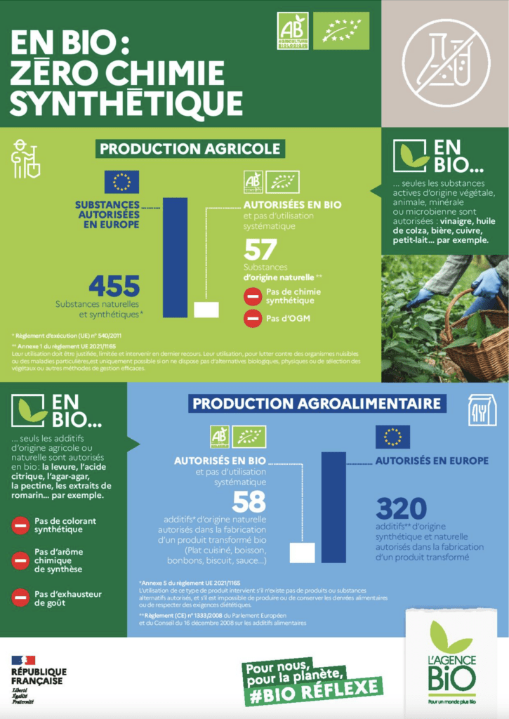Le bio est connu pour l’absence de pesticides de synthèses utilisés pour ses cultures. Mais comme le montre l’infographie ci-dessus, c’est aussi une absence d’utilisation d’OGM en culture, ainsi que dans l’alimentation des animaux. Seuls les additifs d’origine agricole ou naturelle sont autorisés, les arômes ajoutés sont forcément naturels, les conditions de vie des animaux contrôlées, etc.
