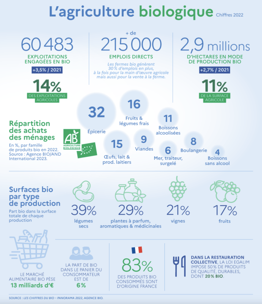 Avec 11% de sa surface agricole en bio, la France était le 1er producteur européen en 2022. De plus, les producteurs de bio sont des employeurs importants dans les territoires ruraux. En effet, produire en agriculture biologique demande 30% de main d’œuvre en plus.