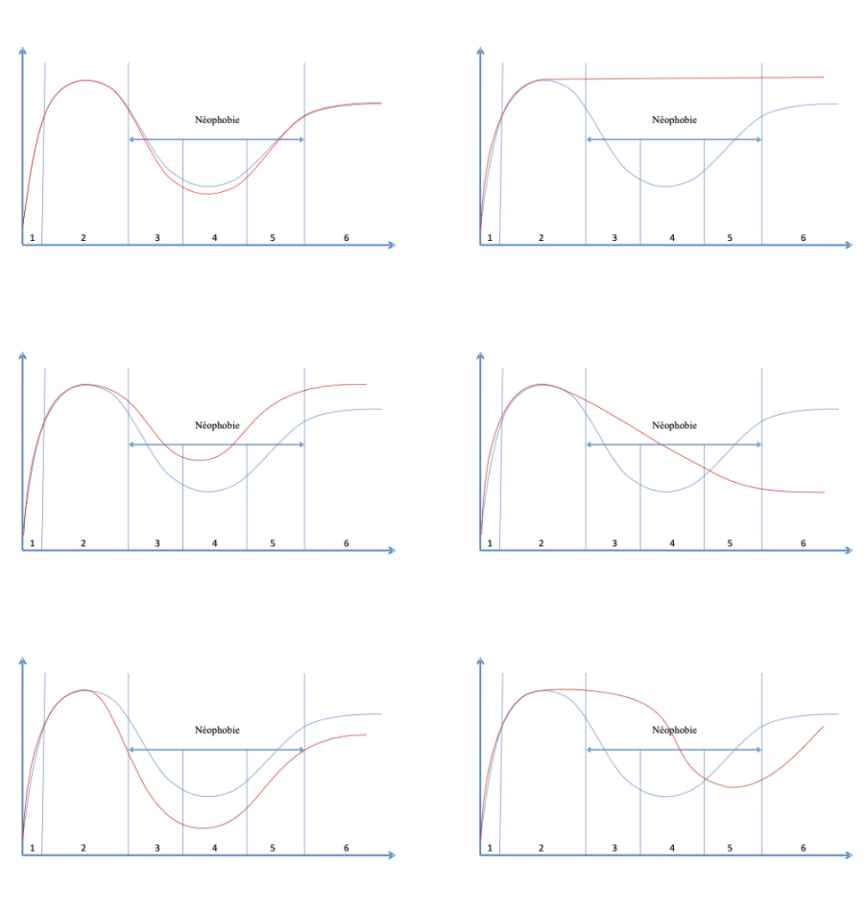 Ce cycle de néophobie est aussi présent en population autistique, mais comme le montre la figure, il peut prendre des formes différentes. La colonne de gauche montre des cas où ce cycle de néophobie des enfants autistes (courbe rouge) est très proche de celui des enfants normotypiques (courbe bleue) avec une intensité moindre (néophobie infratypique) ou au contraire plus importante (supratypique).
