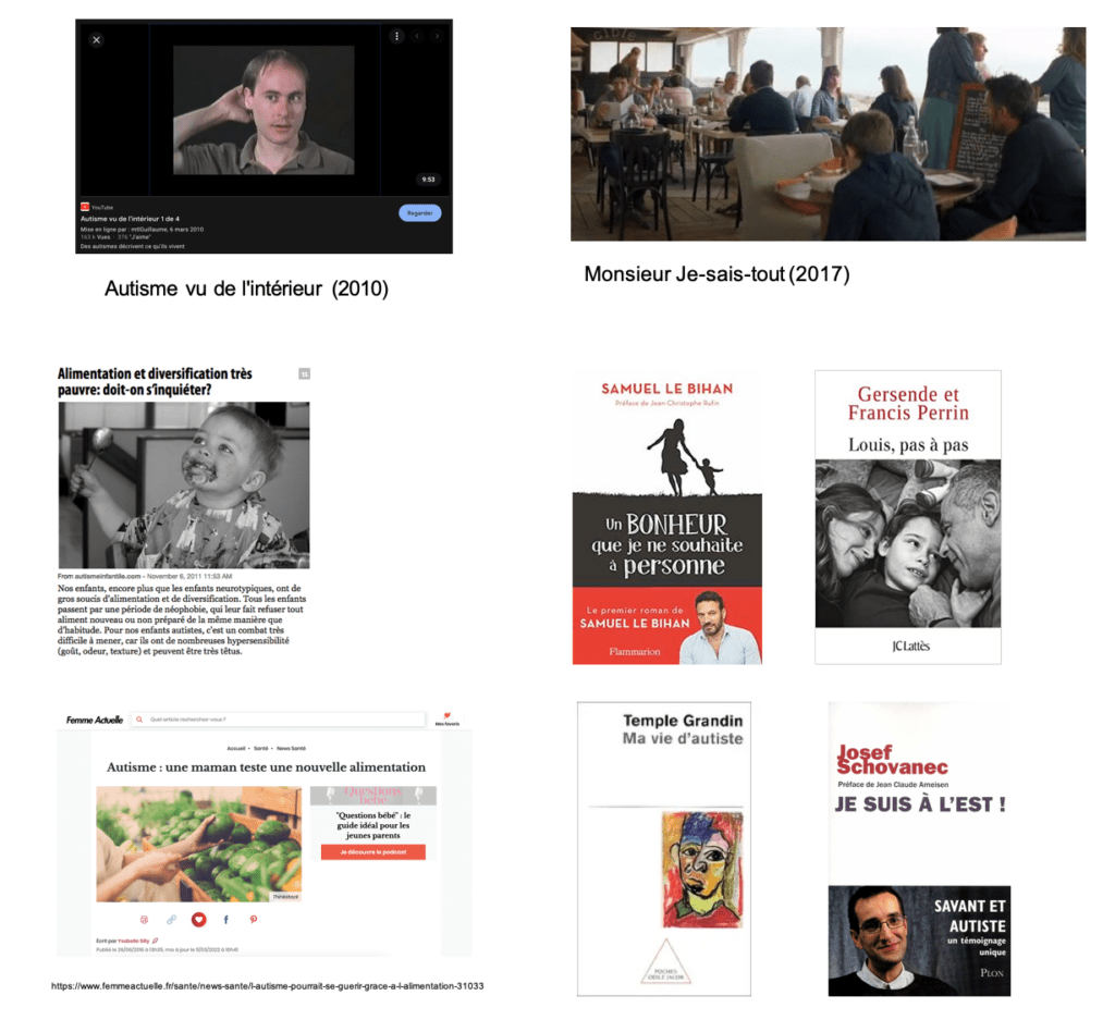 On trouve de nombreux sites Internet et blogs sur cette question de l’alimentation dans les troubles autistiques. Il existe aussi des livres et des documentaires qui abordent cette question. Par exemple dans « Monsieur Je-sais-tout » on voit un enfant aller au restaurant avec ses parents. Mais leur table habituelle près de la fenêtre n’est pas disponible. Cela crée un tel niveau d’anxiété chez l’enfant que ses parents doivent aller négocier avec les personnes déjà attablées pour permettre à l’enfant de manger tranquillement près de la fenêtre.