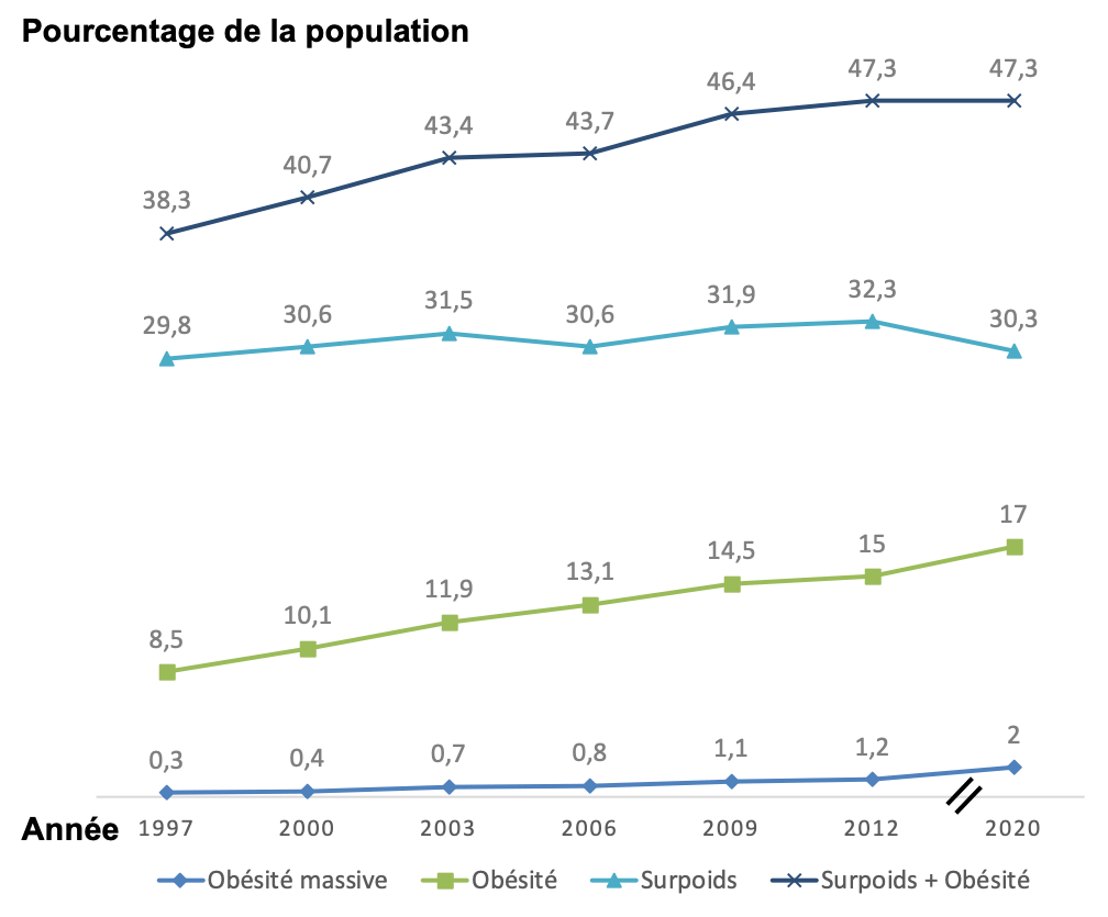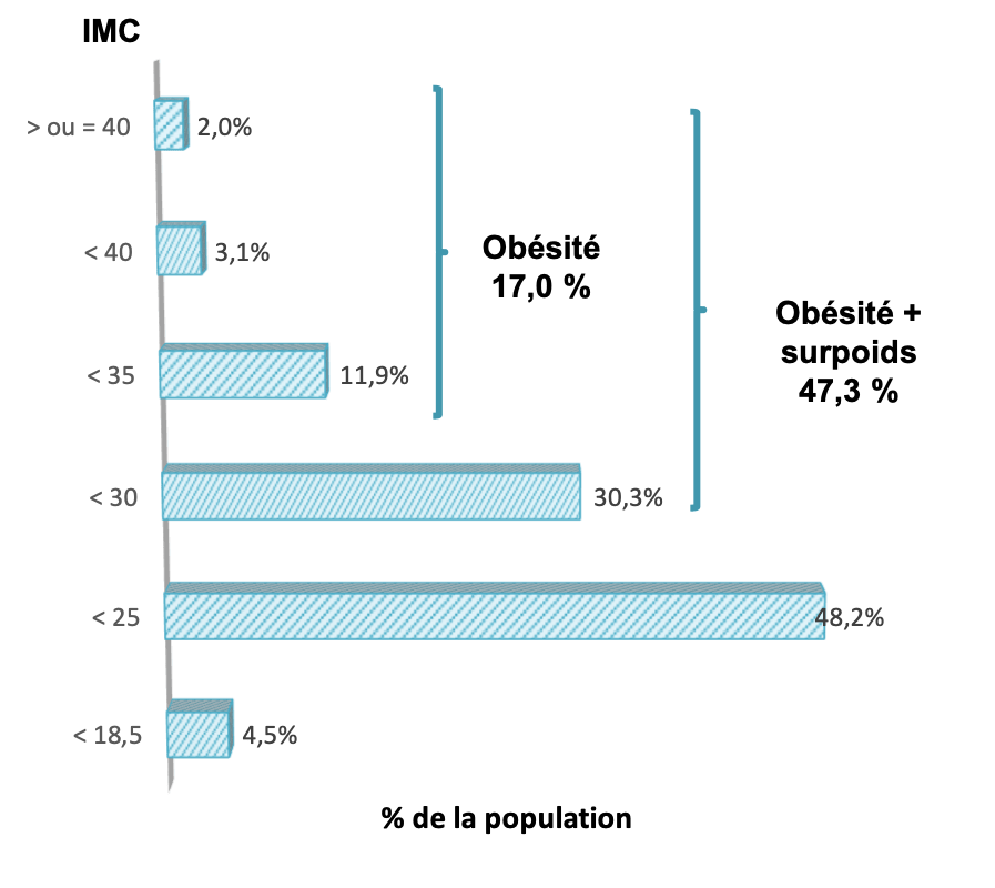 Quand on associe l’obésité et le surpoids, le niveau de 47% de la population est stable depuis 8 ans.