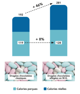 Ainsi, Pierre Chandon a montré dans une étude (1) que si on propose des dragées chocolatées allégées à des volontaires, ils vont avoir tendance à en consommer davantage (46% de plus) que des dragées classiques. Alors qu’ils imaginent consommer à peu près le même nombre de calories.