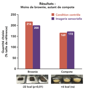 Pour étudier le rôle du plaisir dans le choix des portions, une expérience a été réalisée chez des enfants de classes primaires en utilisant des techniques de stimulation avec de l’imagerie sensorielle (3). Un groupe d’enfants a visualisé des images d’aliments plaisants pour eux (gâteaux, desserts, bonbons, etc.). Puis on leur a demandé de décrire les sensations que cela évoquait pour eux en termes de visuel, goût, odeur et texture. Un autre groupe d’enfants faisaient la même expérience avec des images agréables mais en dehors de l’alimentation (marcher dans des feuilles d’automne, jouer à l’extérieur, etc.). Ensuite chaque enfant devait choisir une portion de gâteau au chocolat parmi 3 tailles possibles.