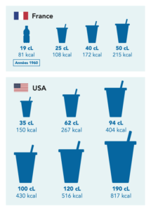 La portion de soda est passée de 19 cL (moins d’1/4 de litre et 81 Kcal) dans les années 1960 à des portions pouvant aller jusqu’à 50 cL (1/2 litre et 215 Kcal) en France, voire 190 cL (817 Kcal) soit presque 2 litres aux États-Unis !Or nous avons tendance, la plupart du temps, de choisir une portion moyenne. En France, elle va être de 40 cL et apporte 172 Kcal. Mais aux US, elle va être plus proche du litre alors qu’il a 50 ans, la portion était de moins d’1/4 de litre.