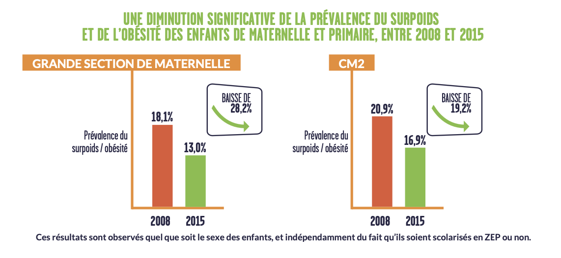 Cette seconde étude montre les résultats d’un suivi entre 2008 et 2015. Des enfants en dernière année de maternelle et en dernière année de primaire (CM2) ont été mesurés et pesés dans 6 villes cette fois-ci. Une diminution de 28% en 7 ans de la prévalence du surpoids et de l’obésité est observée chez les enfants en grande section de maternelle. Cette diminution est de 19% sur la même période chez les enfants en CM2.